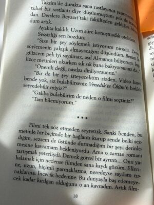 neyse biz tomris’e geri dönelim. alper hasanoğlu’nun 12 nisan tarihli günlüğünde “… Tomris Uyar’ın ‘Aramızdaki Şey’ öyküsü Almanya’da bir yerde geçiyordu…” cümlesini okuduğumdan beri öyküye takıldım kaldım, dönüp dönüp tekrar okuyorum ve tomris’le almanya’da bir araya geldiği o eski öğrencisinin arasındaki şeyin ne olduğunu hissetmeye çalışıyorum… öyküde birlikte izledikleri, thomas mann uyarlaması 1971 yapımı venedik’te ölüm filmini de izledim bu arada ve şimdi de hemen öykünün başında anılan marguerita duras’ın mavi gözler siyah saçlar öyküsünü okuyorum, öyküde geçen kurt adam londra’da filmini de izleyeceğim elbette…